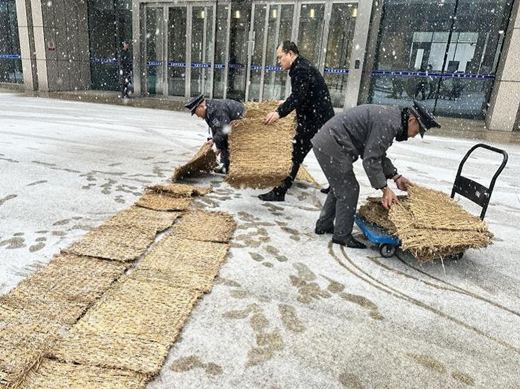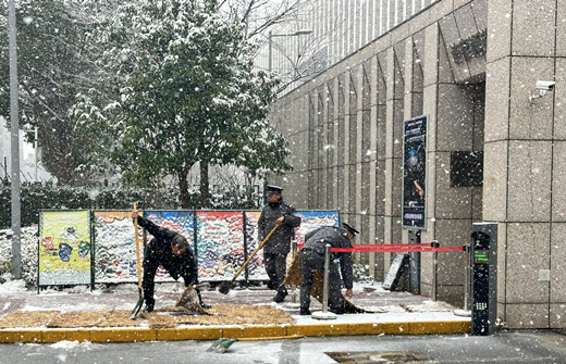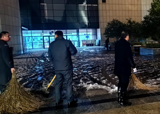 12月18日,無錫迎來了全市強降雪天氣,為錫城換上潔白盛裝,美麗的雪景背后是可能出現的道路結冰與積雪。為了保證警務中心大院的通行安全和正常秩序,防止因路面結冰對車輛通行造成影響,公司領導靠前指揮,迅速部署,全力組織駐警務中心保安中隊實施清雪除冰作業。隊員們在大院主干道及各進出口拋灑工業鹽,鋪上草墊,每小時進行一次破冰除雪,確保車輛、行人安全通行。