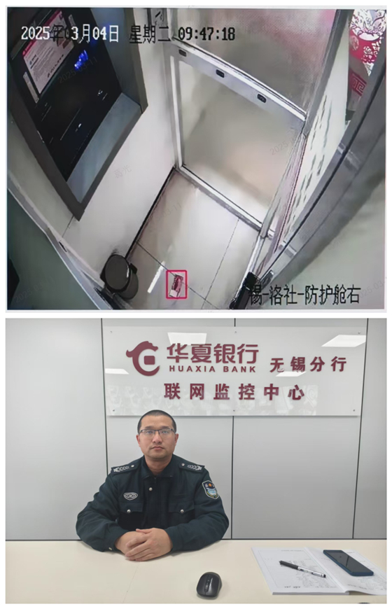 3月4日晚,駐華夏銀行無錫分行監控中心保安員史建平在巡查視頻監控畫面時,敏銳地發現洛社支行防護艙內有異常情況,他把監控畫面放大,發現防護艙內有客戶將部分現金遺落在地上。史建平同志立即啟動突發事件應急預案,使用遠程控制按鈕,將艙門鎖閉,以防他人進出。同時,第一時間通知支行工作人員取走現金,妥善保管等待客戶認領。